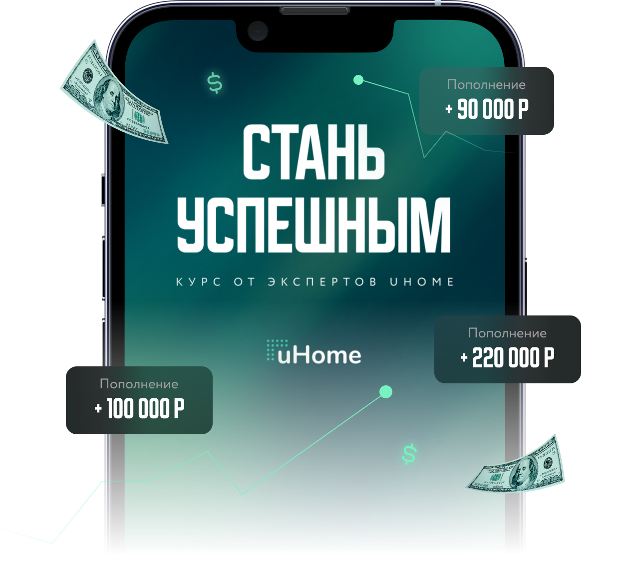 uHome работает с недвижимостью уже больше 8-ми лет! Наша компания предлагает уникальную методику, с помощью которой ты выйдешь на доход в 350.000 со второго месяца.